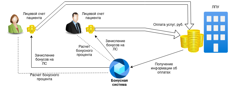 Например пациент за прошедший день получил услуги на сумму 5000р. на его ТЛ прописан бонусный процент 3% значит ему буден начислено 15руб.